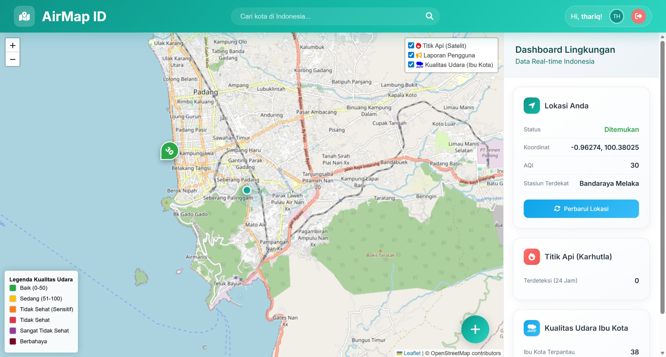 Aplikasi monitoring kualitas udara dan titik api (karhutla) Indonesia dengan peta interaktif, data real-time, dan dashboard lingkungan.