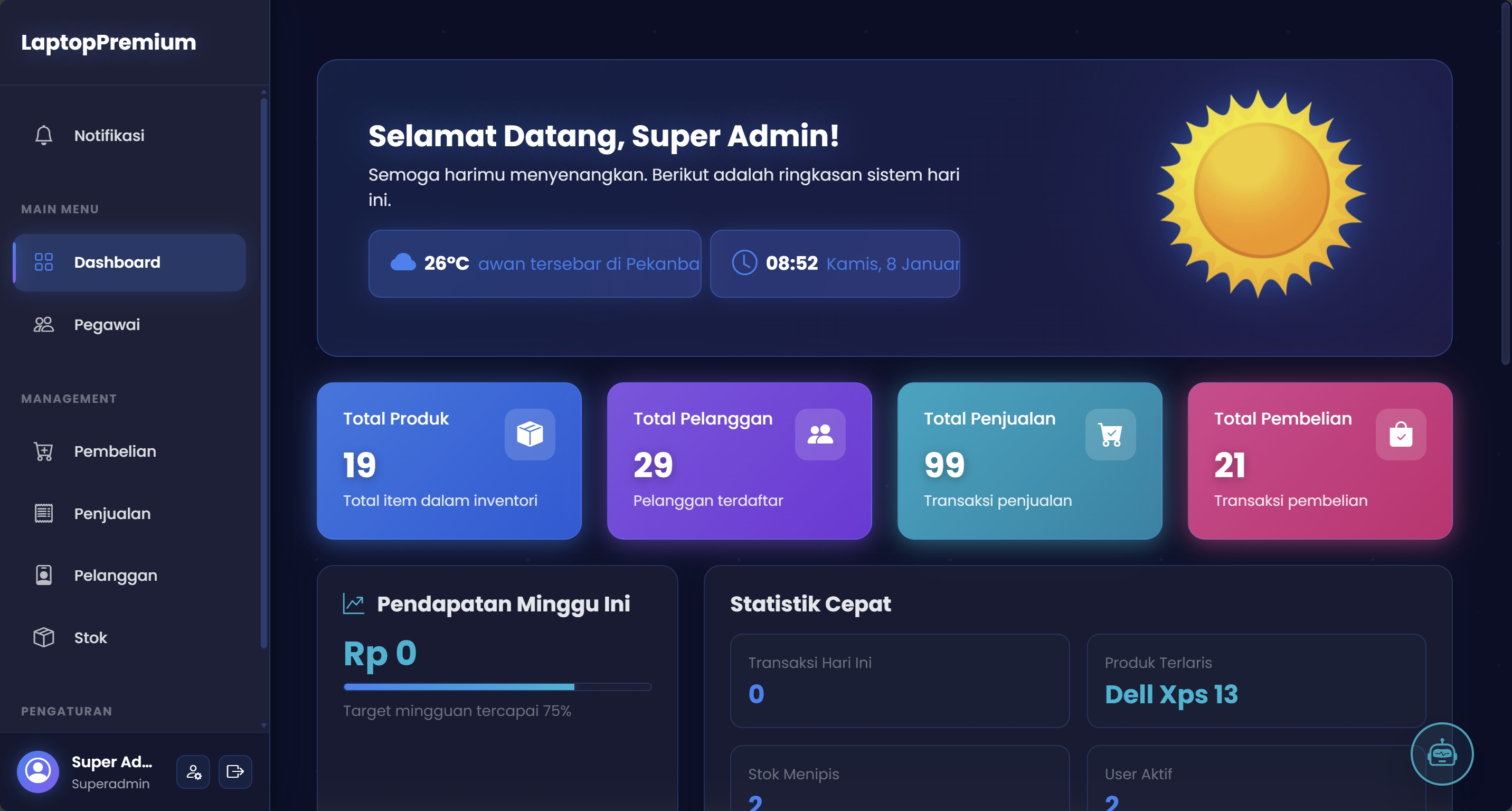 Dashboard admin untuk manajemen inventori laptop dengan fitur pembelian, penjualan, stok, pelanggan, dan statistik real-time.