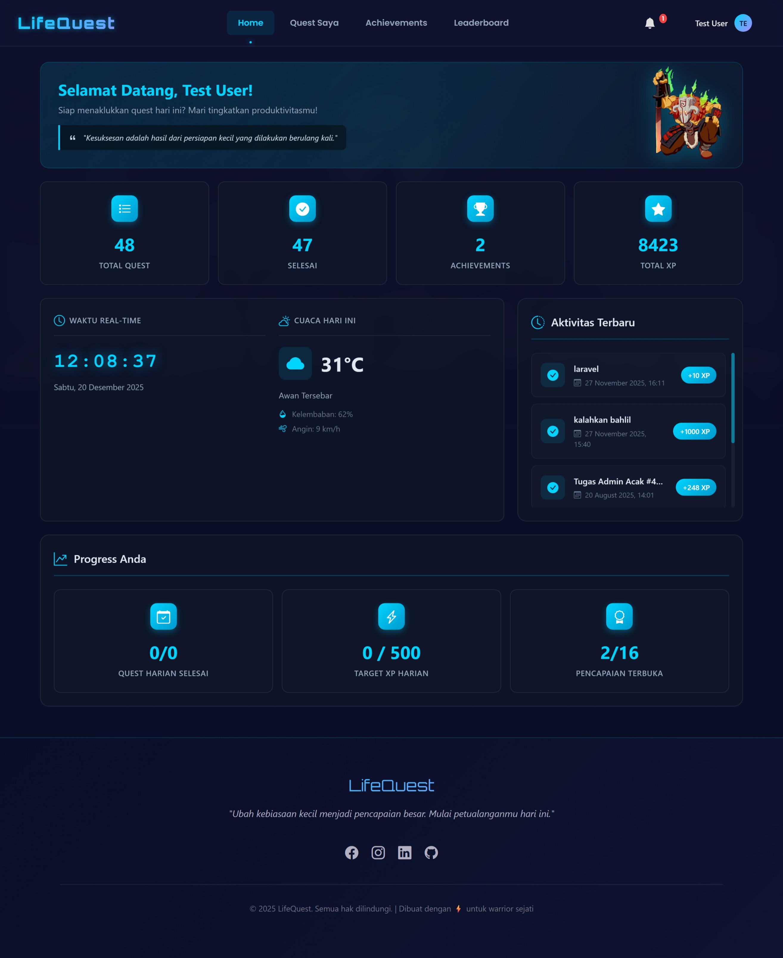 Aplikasi gamifikasi produktivitas dengan sistem quest harian, achievements, XP tracking, cuaca real-time, dan leaderboard kompetitif.